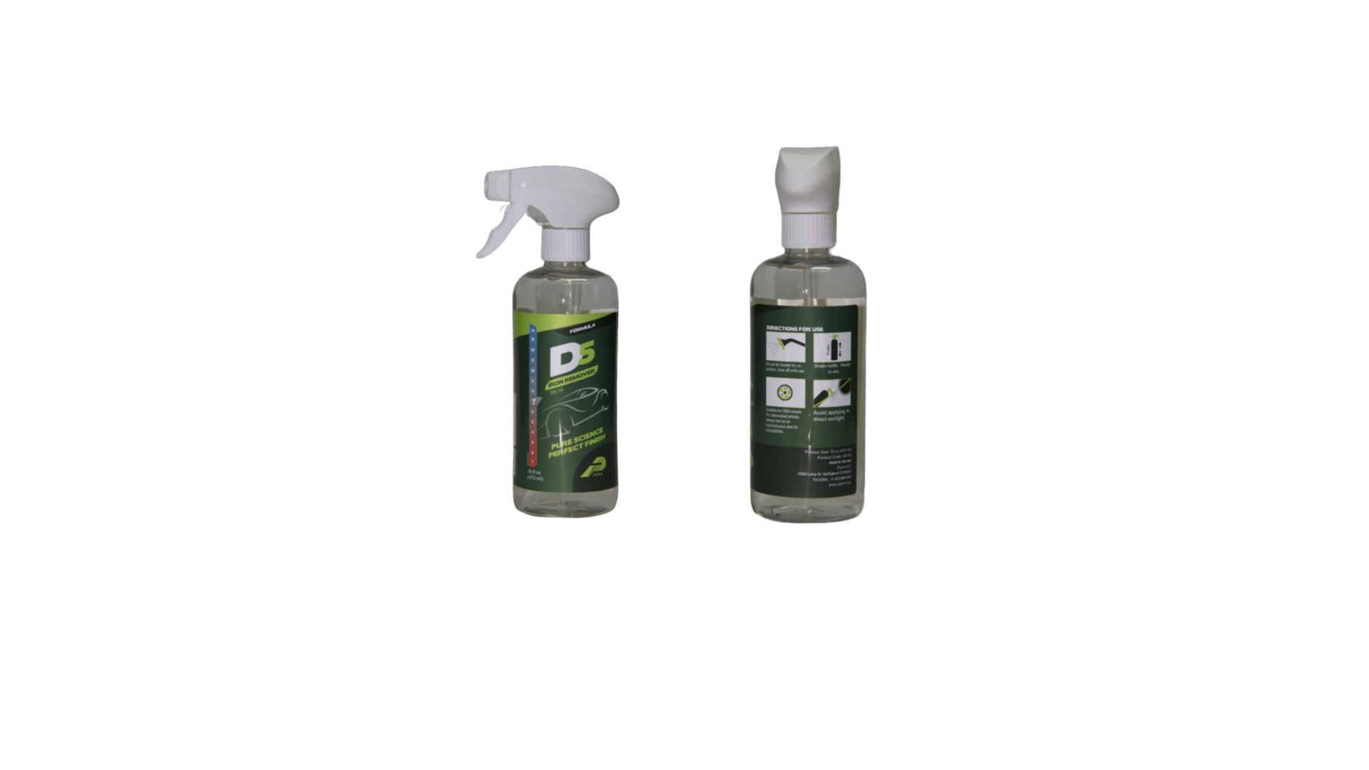 D5 IronRemover Is a highly effective acid-free, non-caustic, pH balanced, cleaner for all types of wheels: steel, alloy, chrome, painted, powder coated, uncoated and anodized aluminum. Effortlessly loosens and removes stubborn grime, such as burnt-on brakedust, oil, grease, rubber residue and other road dirt from wheels, rims, hub caps and lug nuts. Turns a plum color while complexing with iron contaminants.